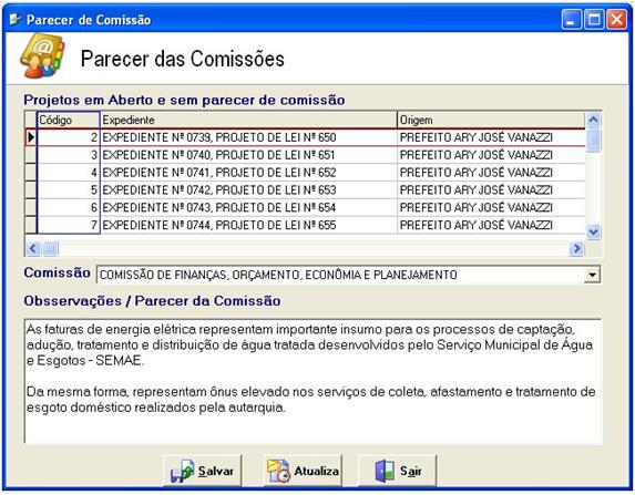Cadastro de todos os tipos de projetos, emendas, requerimentos, moções, pareceres. Inclui novos projetos a qualquer momento, permite imprimir ou exportar os expedientes via internet, por email ou FTP.