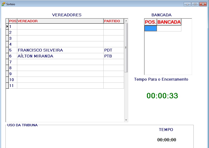 Painel de sorteio eletrônico para a ordem de uso da palavra para vereadores e bancadas.